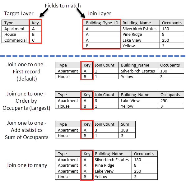 An example of one to one and one to many attribute joins. In this example the one to one joins include the default record, the sum of Occupants, and the maximum from Occupants.