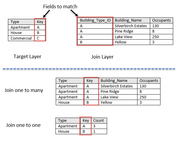 Examples of a one-to-many and one-to-one join. In this example, the one-to-one join only includes the count; additional statistics that can be calculated are shown below.