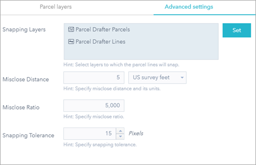 8. Click Advanced Settings > Set and choose the layers you want to snap to by clicking and checking the box next to the Lines and Parcel layers.